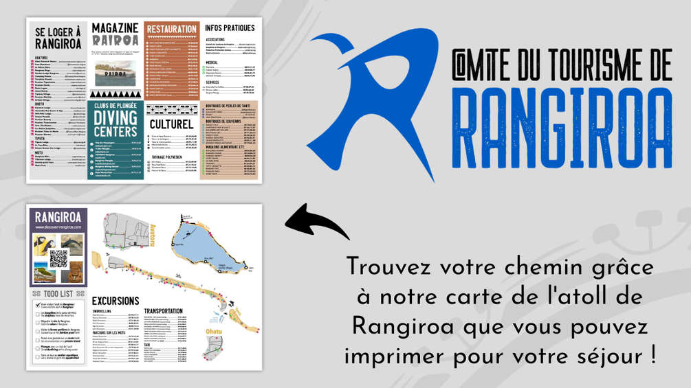 Veuillez trouver notre carte interactive qui vous permettra de trouver votre chemin lors de votre séjour sur l'atoll de Rangiroa en Polynésie française. Vous pouvez imprimer (idéalement en format A3) ce document avant votre voyage afin de faciliter votre séjour sur l'atoll.